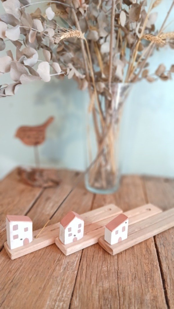 Producto realizado en madera.masisa con detalle de casita puntado a mano